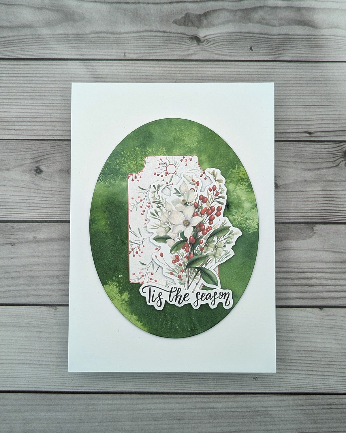 A green shimmer watercoloured oval die cut sits underneath a printed Christmas Tag, with a hand cut spray of Christmas themed plants and a sentiment that reads "Tis The Season".