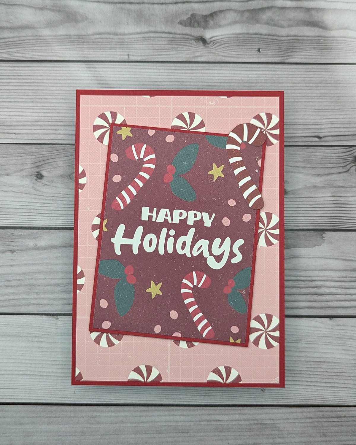 This festive Christmas card features a sweet, playful background of candy canes and round peppermints. The bright, cheerful design captures the fun of the season, making it a delightful card to send holiday greetings to family and friends. The large sentiment reads "Happy Holidays" in a fun font duo.