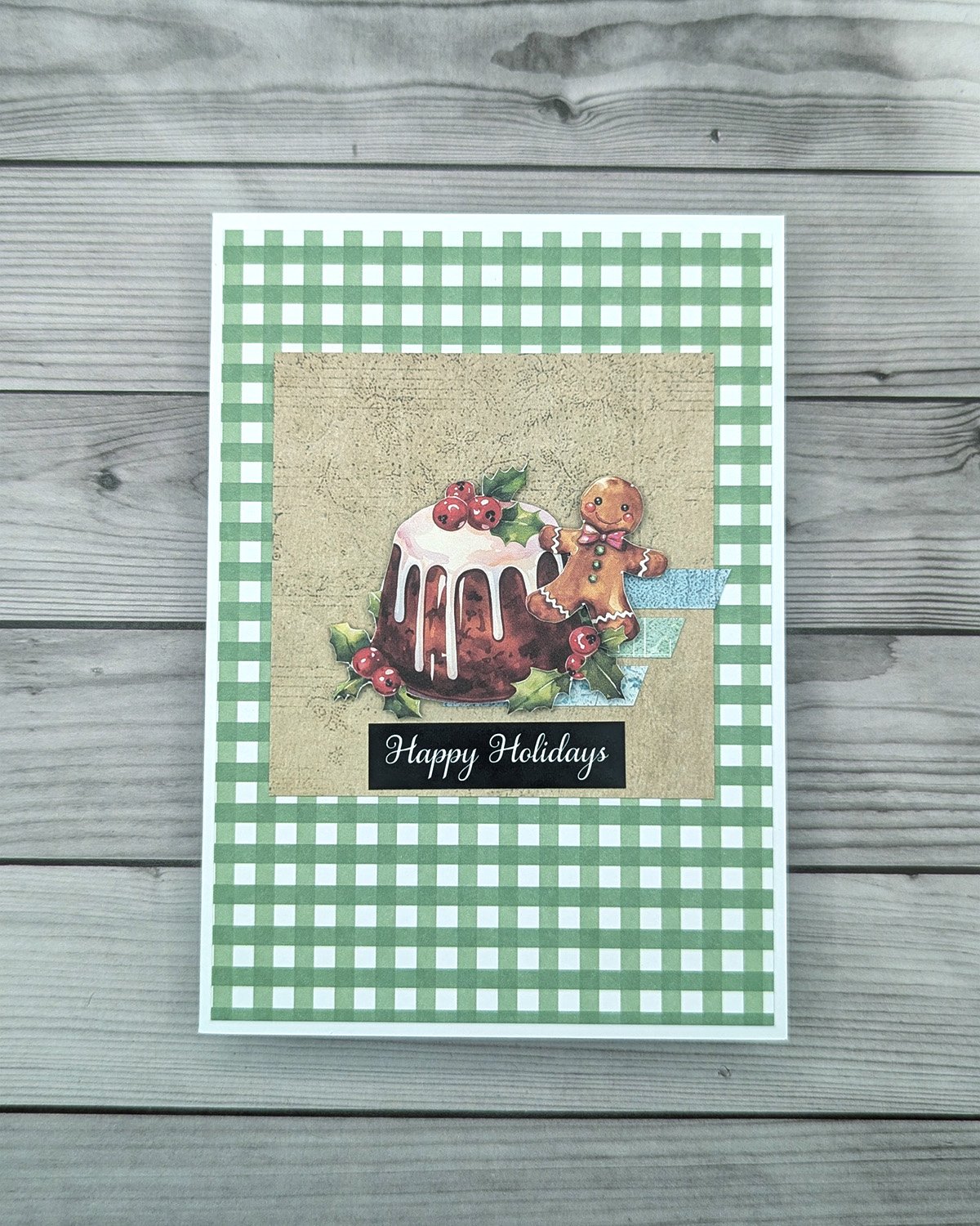 This handmade Christmas Card features a green and white gingham background, sitting under a beige square with has been grunged up. Mounted on top is a plum pudding and gingerbread man with the sentiment "Happy Holidays" underneath.