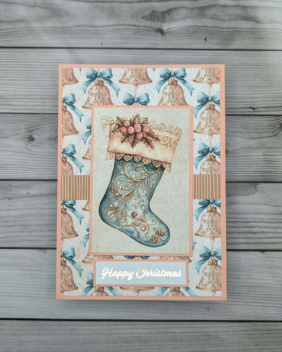 This beautiful handmade Christmas card features a gorgeous patterned background of peach coloured bells decorated with aqua bows. The centrepiece of the card is a large vintage style stocking image, sitting above a rose gold foiled sentiment that reads "Happy Christmas" in a sweet script font.