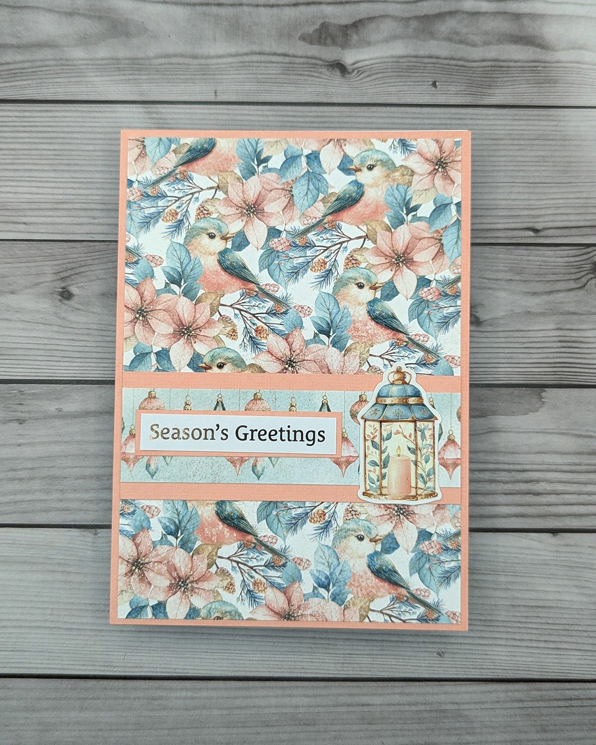 This handmade Christmas card has a gorgeous background patterned paper that features poinsettias, pine branches, birds and pine cones in coordinating colours of peach, light beige and light aqua. Towards the lower half of the card is a ornaments patterned paper strip of paper, that has a die cut lantern mounted to the right hand side, while the "Season's Greetings" sentiment is shimmering in Rose Gold foil is sitting to the left.