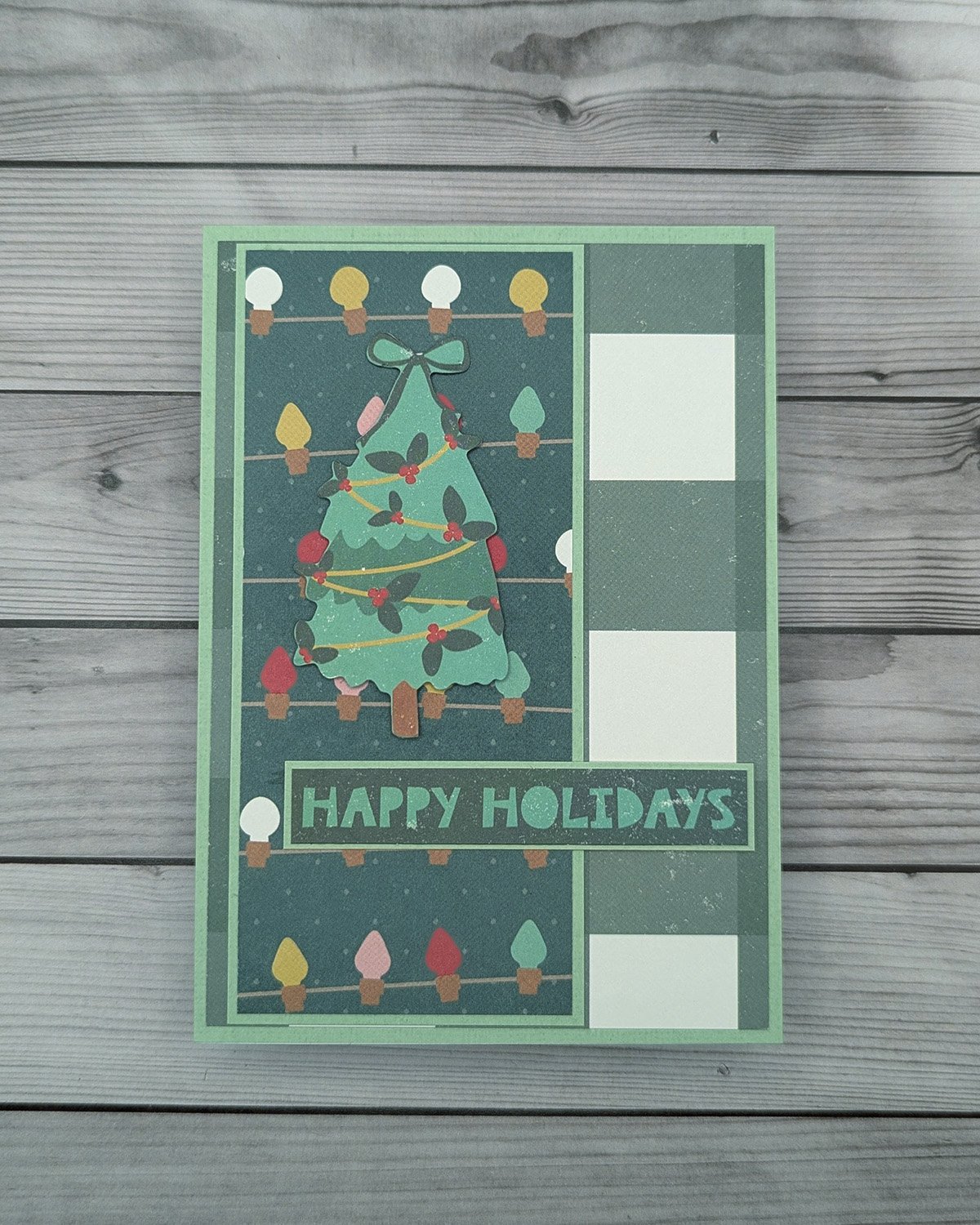 This cheerful Christmas card features green and white tartan patterned paper paired with a strip of colourful festive lights paper. A die-cut Christmas tree adds a festive focal point, while the sentiment “Happy Holidays,” rendered in a fun font, completes the lively, seasonal design—perfect for spreading holiday cheer.