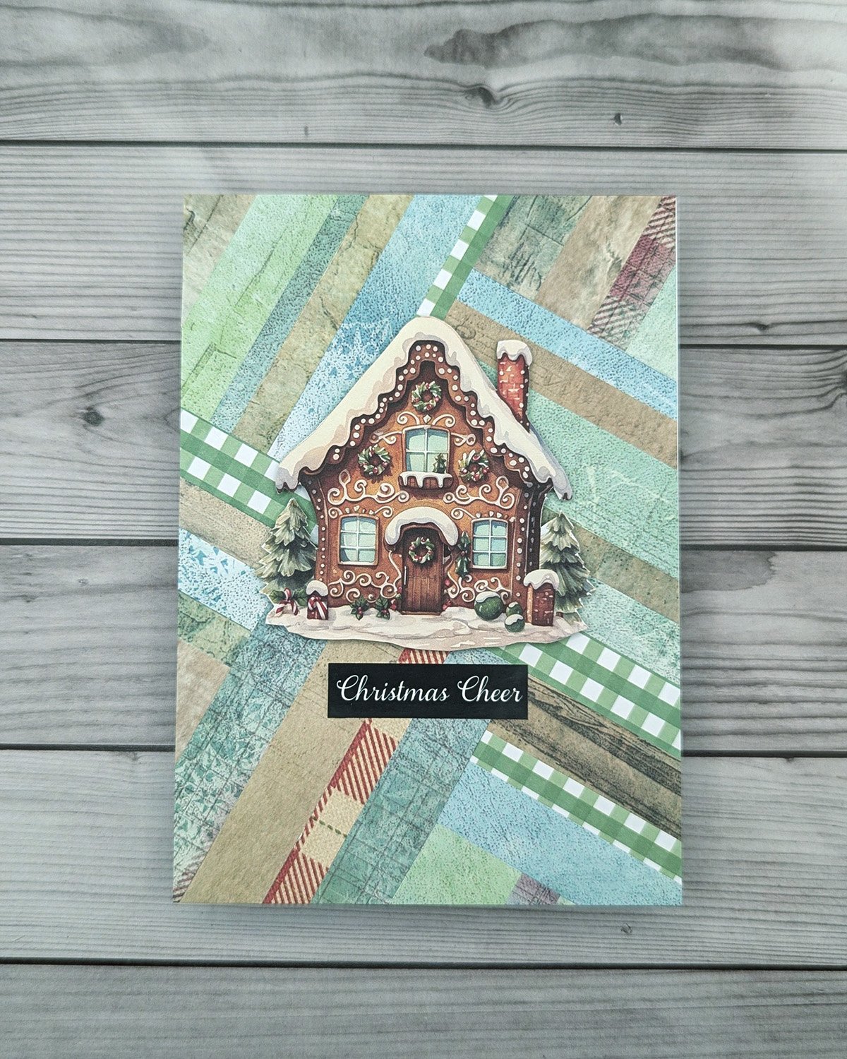 This fun Christmas card features a mix of patterned papers in a herringbone style behind a gingerbread house image. The background is created using the leftover strips of paper from the cardmaking process, making sure I use up as many pieces of the paper as possible. The sentiment sits under the gingerbread house and reads "Christmas Cheer" in a script font.