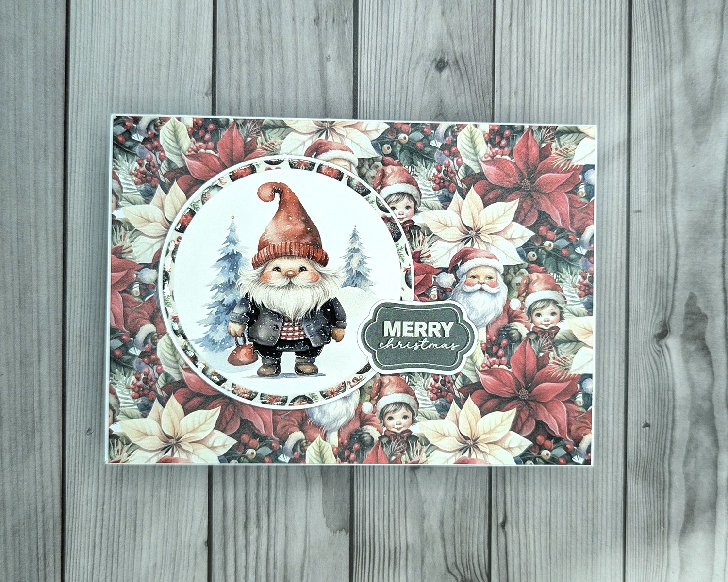 This wonderful Christmas card features a background full of images of Santa, elves, poinsettia and Christmas foliage in a mix of black, reds and off whites. Sitting to the left hand side is a circular image of a gnome in front of several pine trees, with the sentiment "Merry Christmas" to its right.