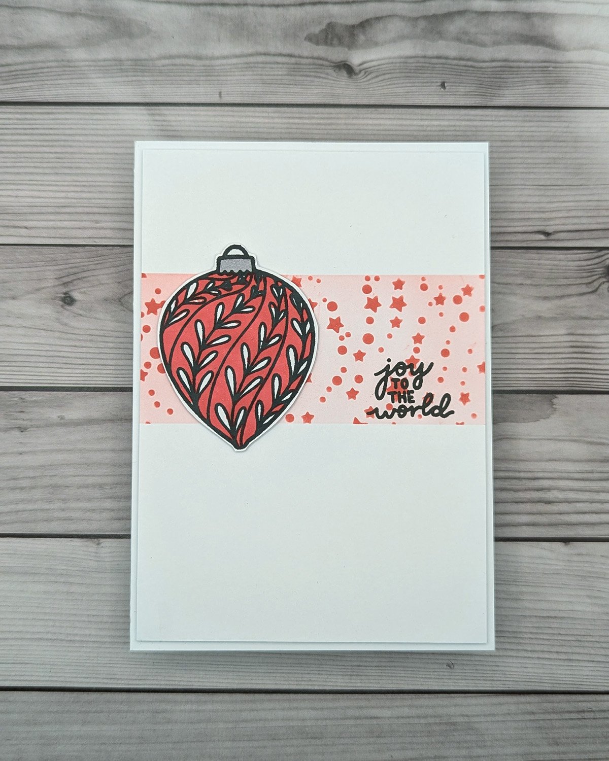 Fresh, modern, and full of festive cheer, this Christmas card features a clean, minimalist design with a bold red ornament as its focal point. The ornament, decorated with a delicate leafy pattern, is handcoloured and sits atop a horizontal strip of red inked paper dotted with tiny stars. To the right, the sentiment “joy to the world” adds a sweet, whimsical touch.