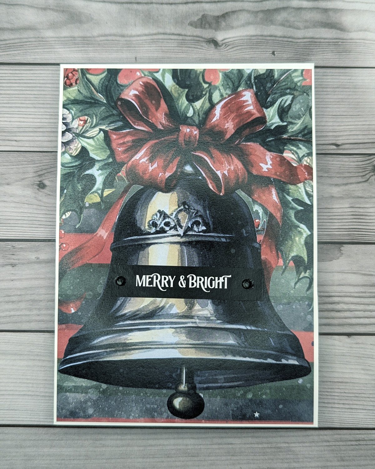 This beautiful Christmas Card features a large dark silver bell image that is topped with a decadent red bow and Christmas foliage. The white on black sentiment reads "Merry & Bright" in an older styled font.