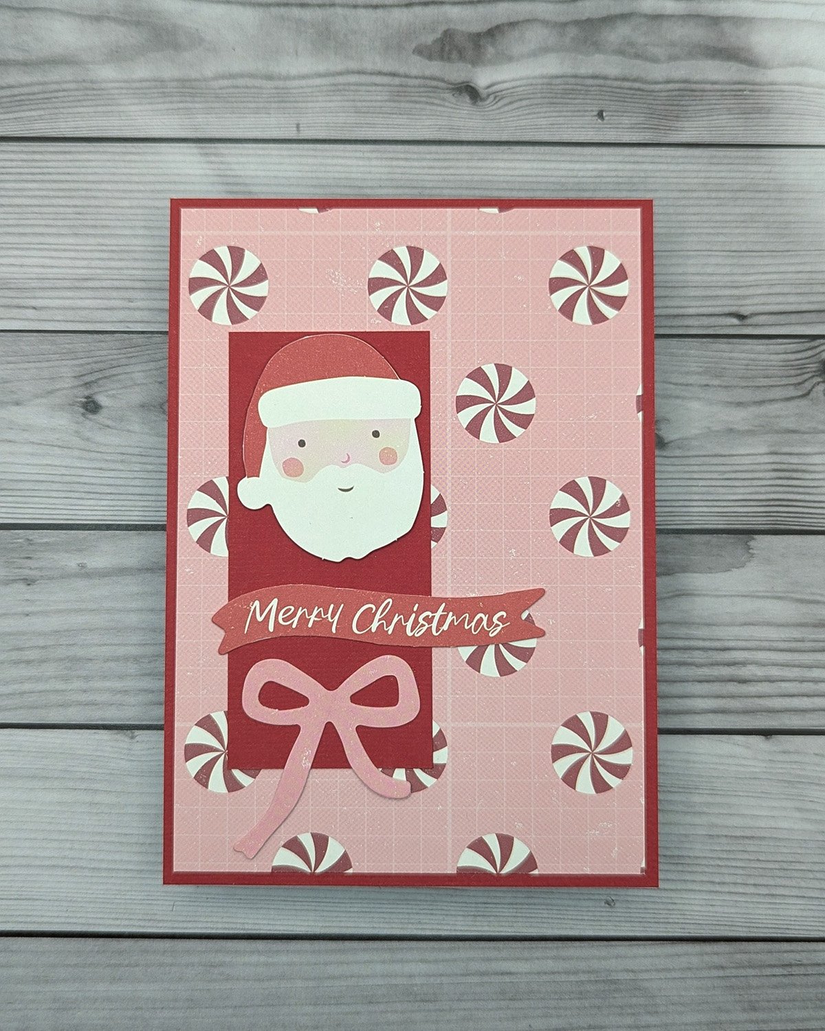 This playful Christmas card features pink patterned paper covered in red and white peppermint rounds. A pink die-cut bow and Santa’s face add festive charm, while the sentiment “Merry Christmas” is displayed on a ribbon banner, completing the cheerful, fun design perfect for spreading holiday joy.