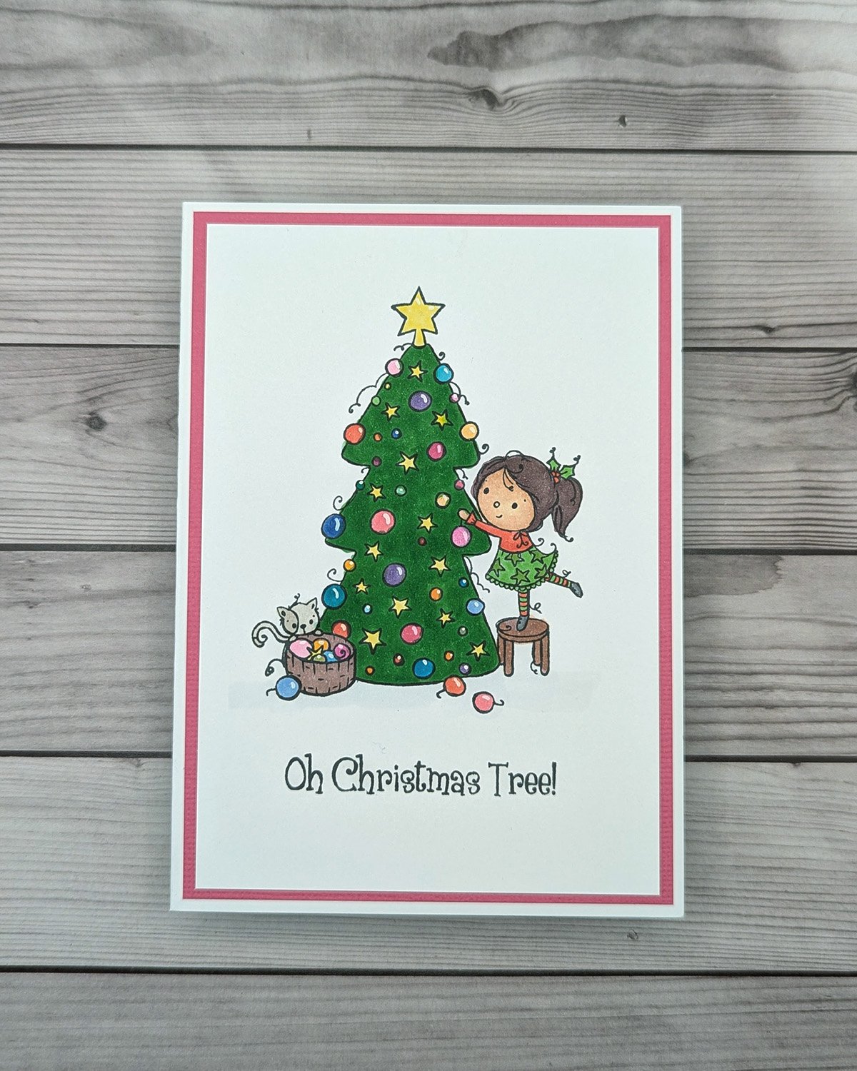 A sweet Christmas card featuring a hand-coloured little girl decorating the Christmas tree with the help of her cat, stamped with care and layered over coloured cardstock for a cheerful festive touch. The clean layout lets the playful characters take centre stage, perfect for sharing a bit of Christmas cheer. The sentiment reads "Oh Christmas Tree!" in a whimsical font.