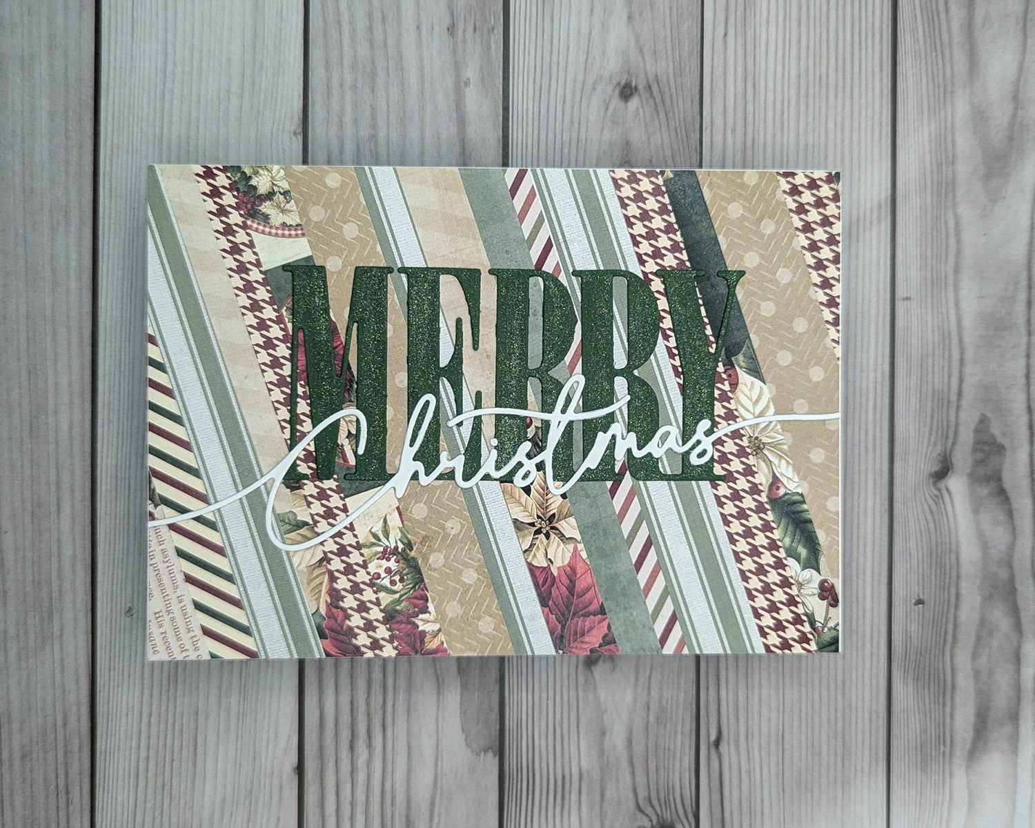 This traditional coloured yet modern Christmas card features a cheerful, festive design made with layered strips of patterned paper in classic holiday colours. A large, bold “Merry Christmas” die cut takes centre stage, creating a focal point that pops against the patterned backdrop. The combination of rich reds, greens, and subtle accents gives the card a warm, timeless feel, perfect for sending holiday cheer to family and friends.